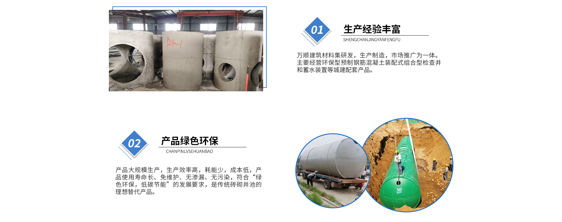 黃山市萬順建筑科技有限公司是集研發(fā),生產制造,市場推廣為一體的綜合性企業(yè)。公司主要經營環(huán)保型預制鋼筋混凝土裝配式組合型檢查井和蓄水裝置等城建配套產品。產品生產過程采用獨特的生產工藝,機械化流水作業(yè)。產品大規(guī)模生產,生產效率高,耗能少,成本低,產品使用壽命長、免維護、無滲漏、無污染,符合“綠色環(huán)保,低碳節(jié)能”的發(fā)展要求,是傳統磚砌井池的理想替代產品。
